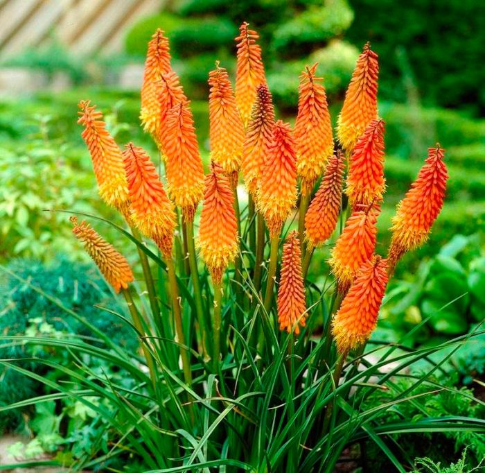 Книфофия, также известная как "Тритома" или "Красный факел", — это экзотическое многолетнее растение, которое станет ярким акцентом в вашем саду. Ее высокие цветоносы, увенчанные густыми соцветиями ярко-красного, оранжевого или желтого цвета, привлекают внимание и создают эффектный контраст с зеленью листвы. Книфофия цветет с середины лета до осени, радуя глаз продолжительное время.